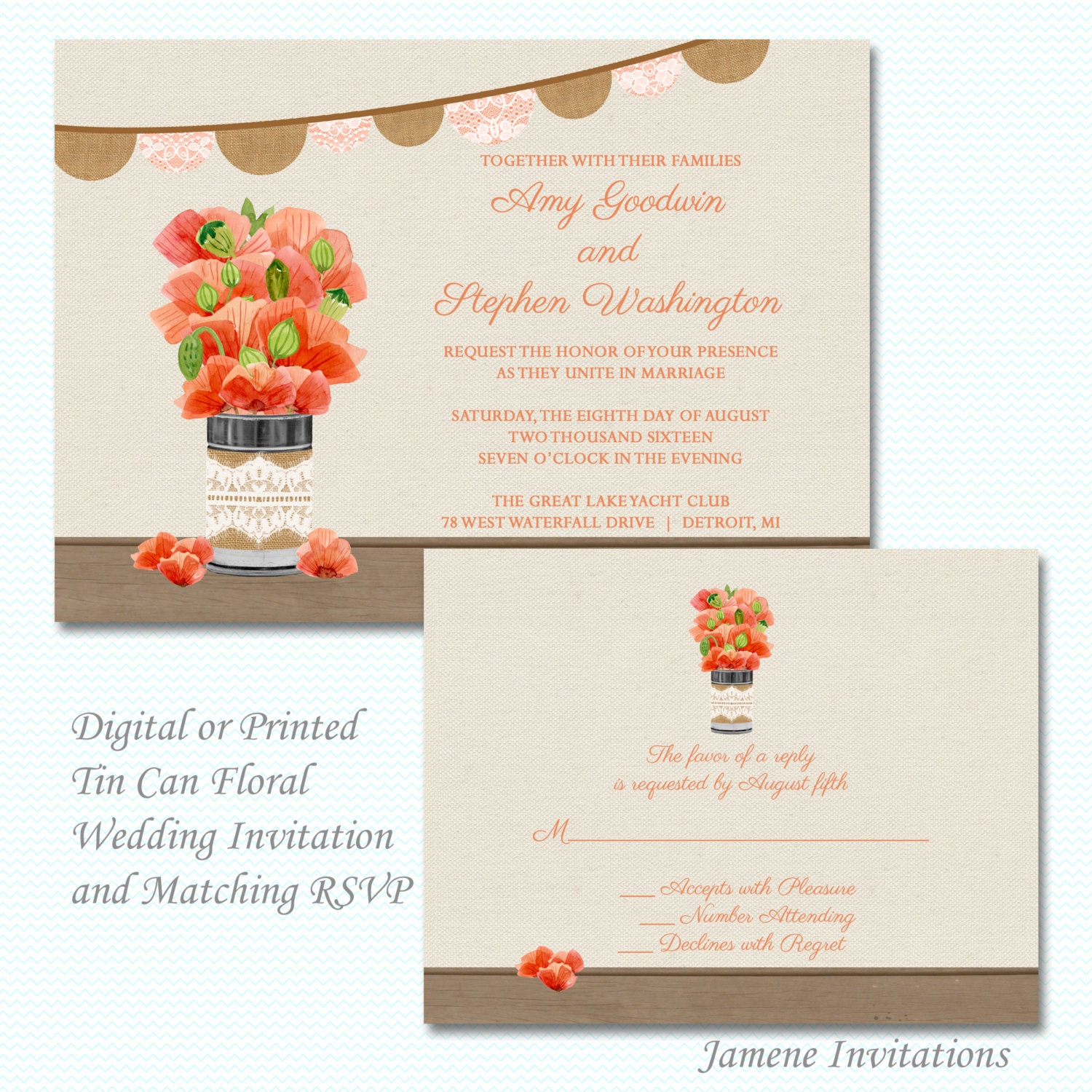 Wedding Invitation and RSVP Rustic Tin Can Burlap and Lace